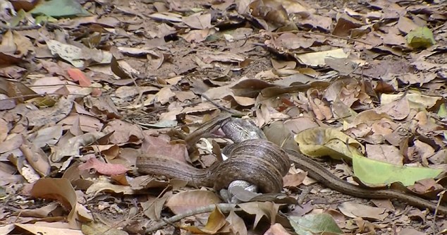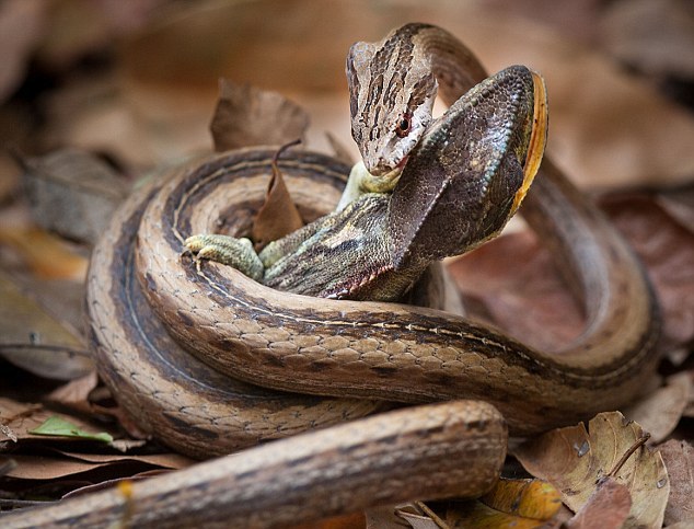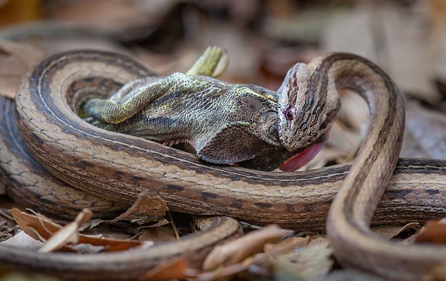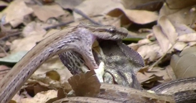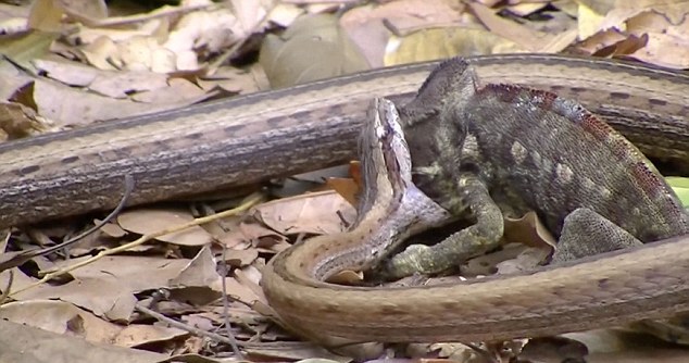 Στις φωτογραφίες αλλά και στο βίντεο, φαίνεται το ερπετό να τριγυρνάει γύρω από το θήραμά του, πριν τελικά «χτυπήσει» παραλύοντας το χαμαιλέοντα με το τοξικό δηλητήριο του.