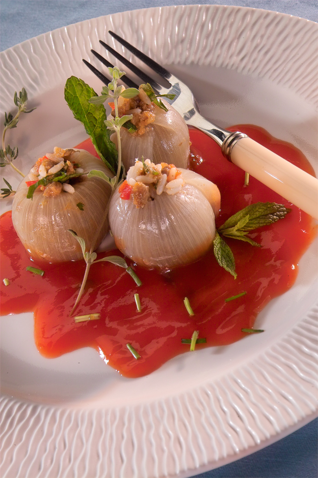 4. Σερβίρετε σε πιάτο τοποθετείστε τα γεμιστά κρεμμύδι στο κέντρο του πιάτου και περιχύνετε με την σάλτσα του, γαρνίρετε με φρέσκα μυρωδικά, συνοδεύετε με τυρί φέτα και δροσερό σαββατιανό κρασί.