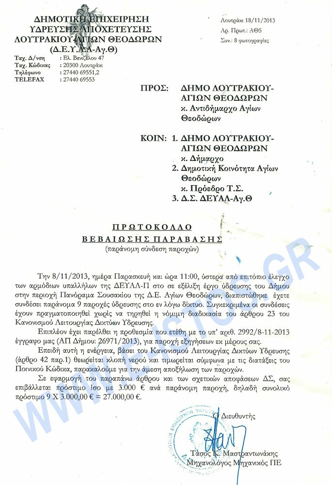 Το τοπικό site των Αγίων Θεοδώρων ISTOS.GR φέρνει στην δημοσιότητα έγγραφο της ΔΕΥΑΛ-Π σύμφωνα με το οποίο ο Διευθυντής της Τάσος Μαστραντωνάκης επιβάλει πρόστιμο 27.000 ευρώ για 9 παράνομες συνδέσεις νερού στη περιοχή Σουσάκι Αγίων Θεοδώρων.