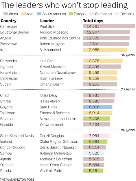 Μπορεί αυτό να μην είναι συχνό φαινόμενο στη Δύση, όπου στις περισσότερες χώρες υπάρχει όριο για τις θητείες, ή η κόντρα μεταξύ των κομμάτων κάνει εξαιρετικά δύσκολο για κάποιον να παραμείνει στην εξουσία για καιρό. Ομως, στον υπόλοιπο κόσμο, η κατάσταση είναι διαφορετική, όπως αναφέρει η Washington Post σε σχετικό άρθρο.