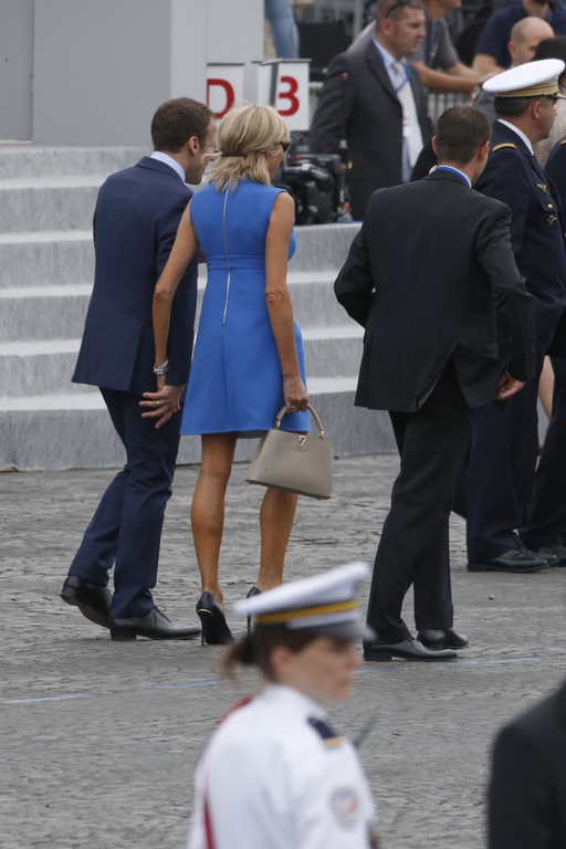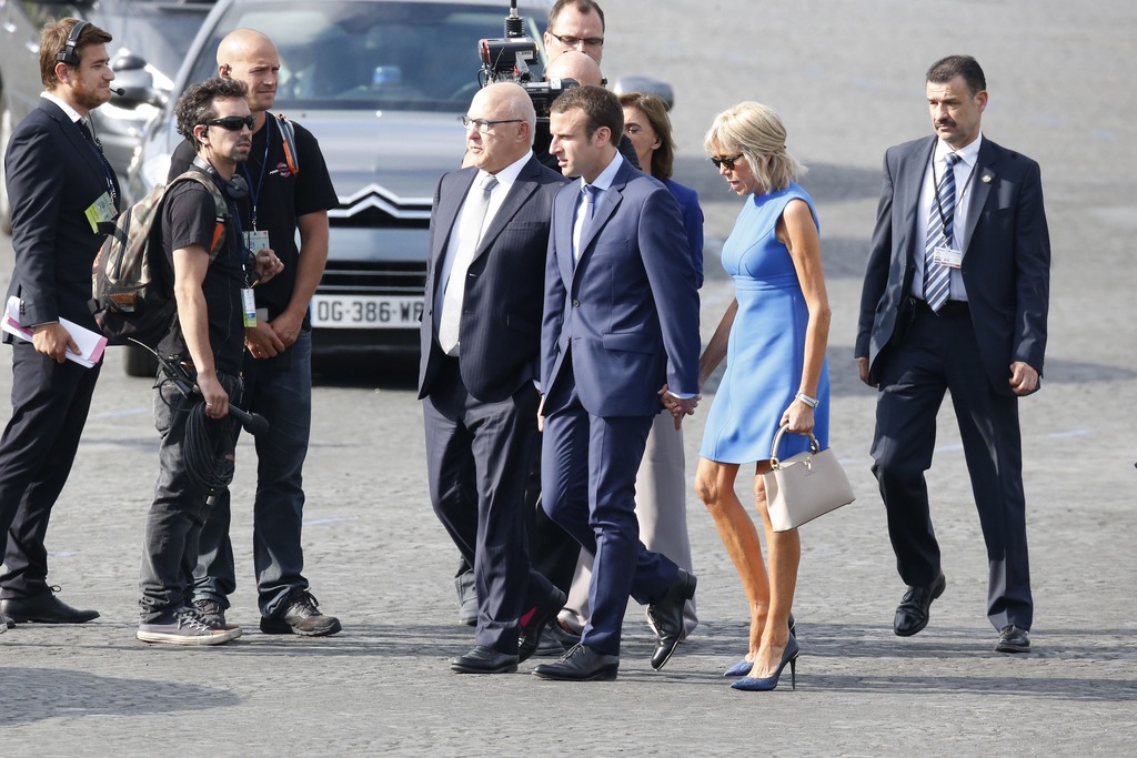Εδώ, ο Εμανουέλ Μακρόν με την σύζυγό του, την οποία κρατάει από το χέρι και τον γάλλο υπουργό Οικονομικών Μισέλ Σαπέν, στην παρέλαση της 14ης Ιουλίου 2015.