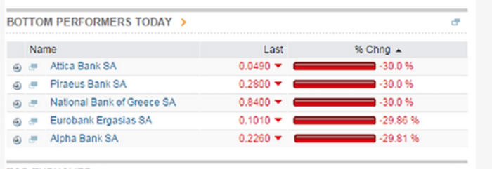 Ενδεικτικό της… «σφαγής» στο ταμπλό είναι ότι η μετοχή της Τρ. Πειραιώς έχει κλειδώσει στο -30%, στα 0,28 ευρώ με 55 εκατ. τεμάχια προς πώληση, η Εθνική Τράπεζα βρίσκεται επίσης στο -30% στα 0,84 ευρώ με 16 εκατ. τεμάχια προς πώληση, η Alpha Bank είναι στο -30% στα 0,226 ευρώ με 95 εκατ. τεμάχια προς πώληση και η Eurobank επίσης στο -30% στα 0,101 ευρώ με 133 εκατ. τεμάχια προς πώληση.